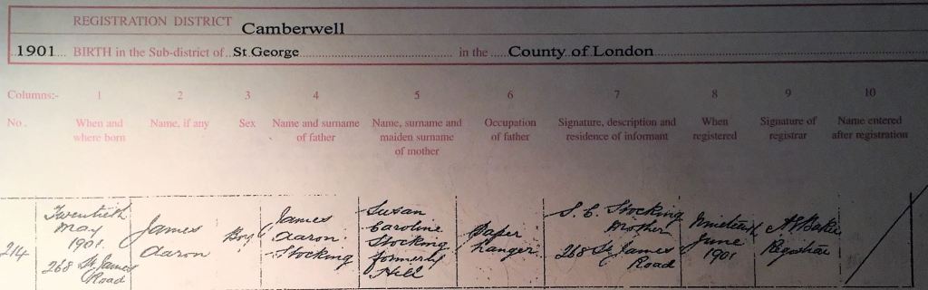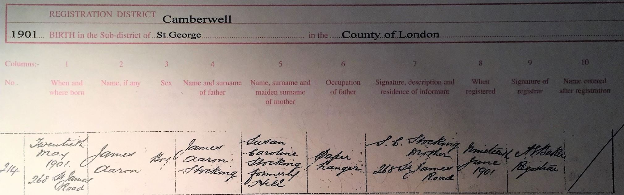 - Birth certificate James Aaron Stocking, Camberwell St George, b.20 May 1901