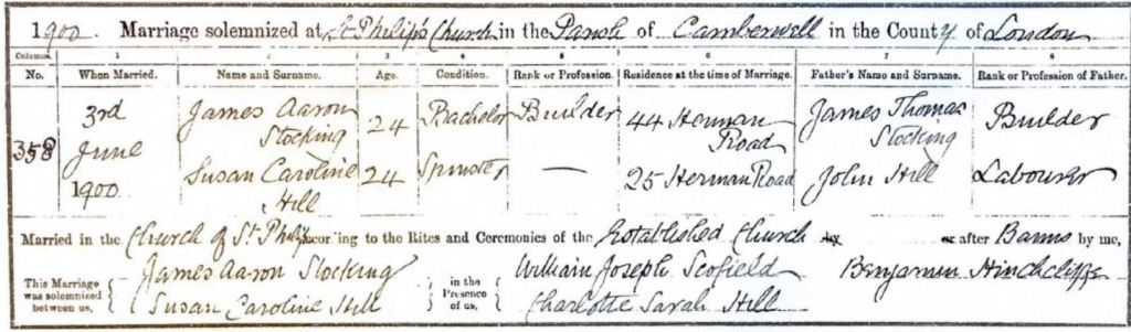 Susan Caroline Hill married James Aaron Stocking at St Philip the Apostle Church, Avondale Square, Camberwell, on 3 June 1900. The bride is shown on the marriage certificate as the daughter of John Hill, a Labourer. Both parties signed their names, were single and aged 24, and at the time of the marriage were living at different addresses in Herman Road, Southwark (see extract from their marriage certificate, below).