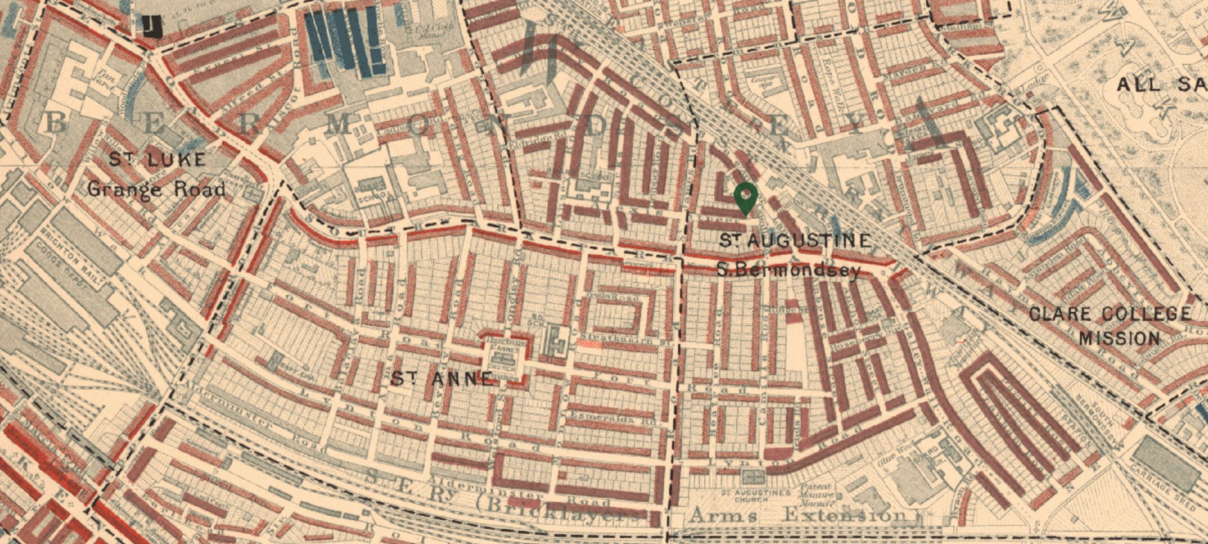 As can be seen from a contemporary map from the National Library of Scotland’s collection, Vauban Street was surrounded by tightly packed streets of housing, glue and size works, tanneries and other industry. Charles Booth’s survey of life and work in London in the late 1890s records Vauban Street as: