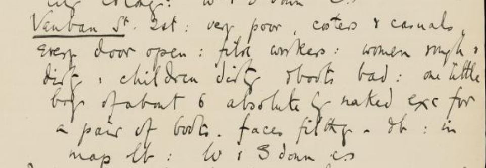 St: very poor, costers casuals, every door open; ? workers; women rough and dirty, children dirty & boots bad. One little boy of about 6 absolutely naked exc for a pair of boots. faces filthy.