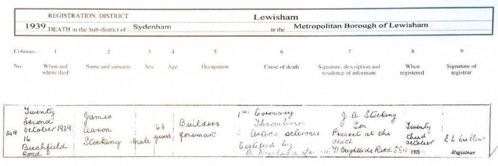 James Aaron Stocking died at home in Catford on 22 October 1939, four weeks after the 1939 Register was taken. He was 63 years old. By then, the family had been living at 16 Beechfield Road for around 28 years. His death certificate records his occupation as Builder’s Foreman. His son (my grandfather) James Aaron Stocking of 71 Brightside Road, SE13, registered the death the next day, and is shown as present at the death (see below). James Aaron junior would have been 38 at the time. The cause of death is a heart attack:”1(a) Coronary thrombosis, (b) Arterio sclerosis, certified by B. Rowlands”. He was buried on 27 October 1939 at Hither Green Cemetery.
