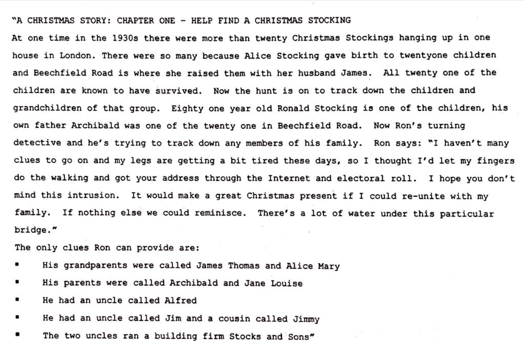 Remarkably for the time – and the area of London they were living in, 16 of their children survived to adulthood and most went on to marry and have children of their own. Not quite the 21 Christmas Stockings mentioned in Ron’s letter, but close enough. Ron Stocking died in 2005, his father Archie in 1961. Ron’s sister Joan had a son, Roy, my second cousin once removed, who was in touch towards the end of 2022 about our shared family history.