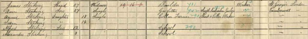 By the 1911 census, Alice had died (in 1907) and James Thomas Stocking filled in the census form that year as a widower: