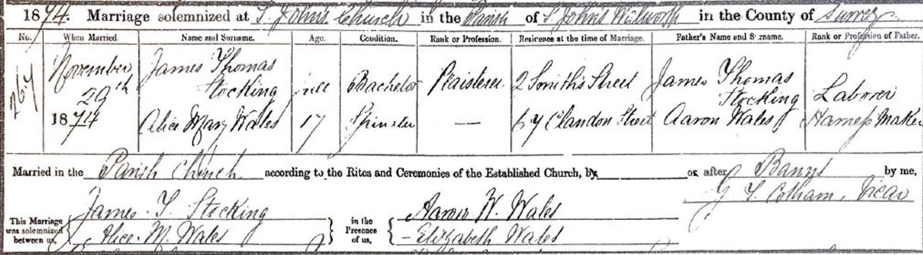 They were married by banns when James Thomas Stocking was ‘of full age’ and Alice Mary Wales was just 17. James was actually 21 years and five months old. He was working as a Plasterer, living at 2 Smith’s Street, son of another James Thomas Stocking, a Labourer. Alice Mary was living at 67 Clandon Street, and her father is named as Aaron Wales, a Harness Maker. The witnesses are her brother Aaron W Wales (who died in an accident a year later) and Elizabeth Wales – who may have been Aaron’s wife, or Alice’s sister, both called Elizabeth. All parties sign the register.