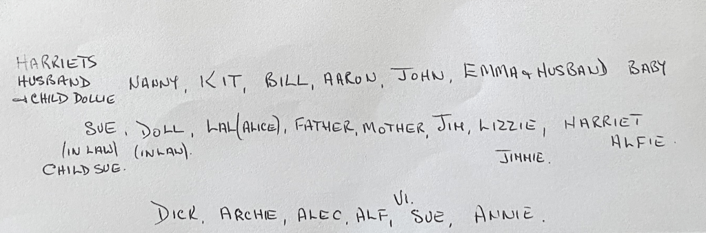 While the photo wasn’t necessarily taken during Victoria’s reign (she died in 1901), the family is certainly one that grew up during at least some of her 64 years on the throne. Perhaps in honour of the new King Edward VII and his Queen, Alexandra, they named their youngest son, born in 1902, Alexander Edward Stocking. Could he be one of the young boys seated centre front, about the same age as my grandfather? The annotations on the second photo certainly suggest that’s so.