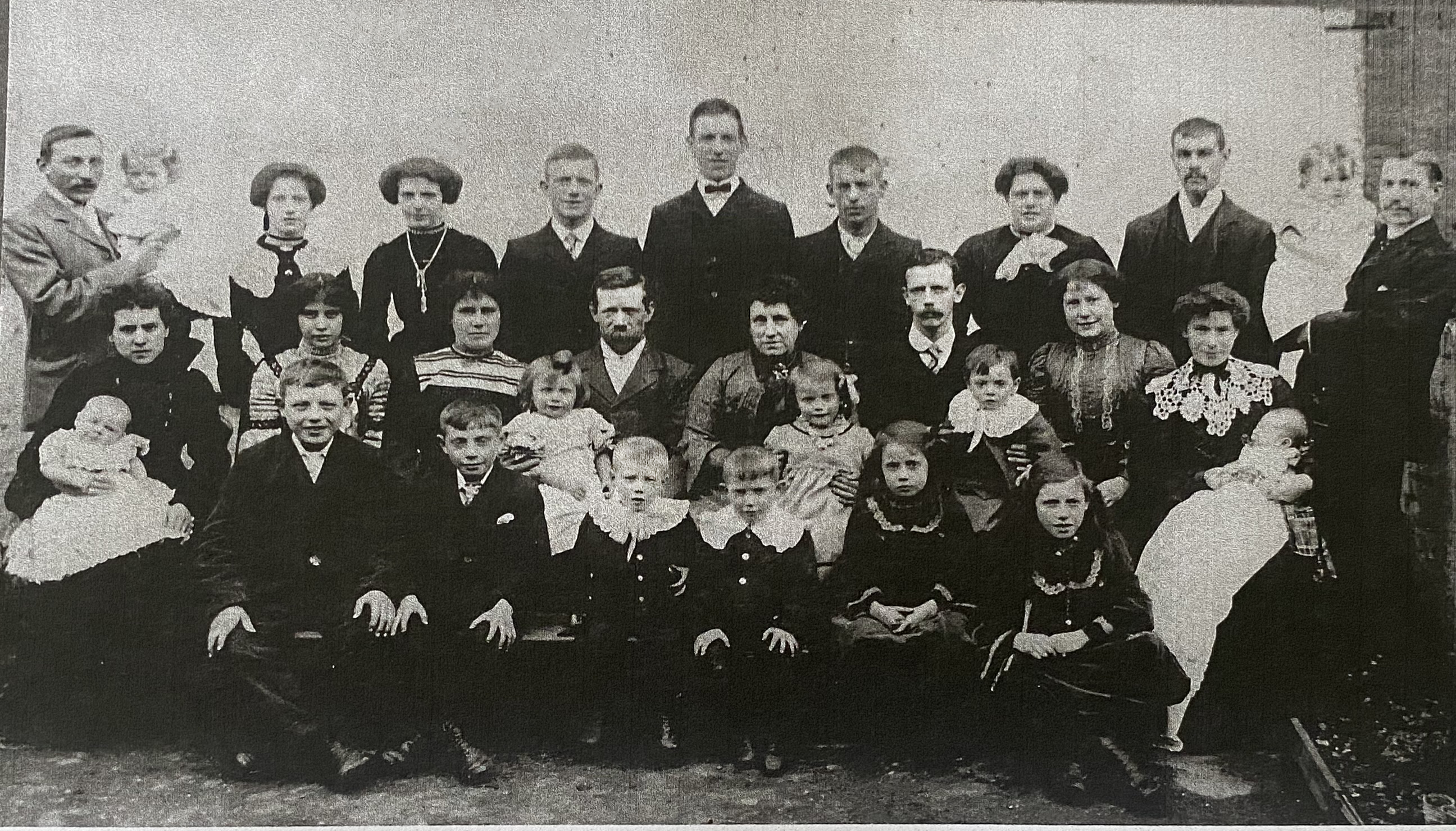 James Thomas Stocking and Alice Mary Wales had 19 children in total, and many of them – we believe – are shown here, some with their spouses, the eldest largely at the back, the youngest – apart from the babies – in the front.