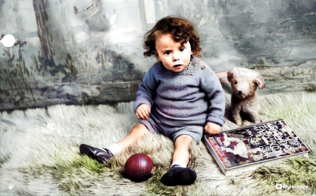 The photo below left – also enhanced at MyHeritage – is of my Dad aged about 2-3 years; he looks remarkably like his father, sitting on his own father’s knee in the big family photo (cropped version below right):
