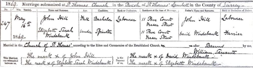 - Marriage certificate John Hill and Elizabeth Sarah Windebank, Lambeth St Thomas, 1869 (GRO)