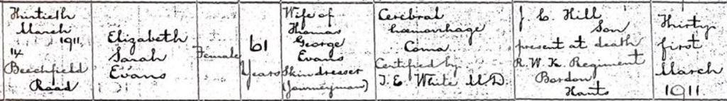 Elizabeth Sarah Evans’ death is recorded on 30 March 1911 at 14 Beechfield Road. Aged 61, she died of a cerebral haemorrhage and coma. Her death was registered by her son, J. C. Hill, Soldier, NW Kent Regiment. She and Thomas George Evans had been married for 15 years.