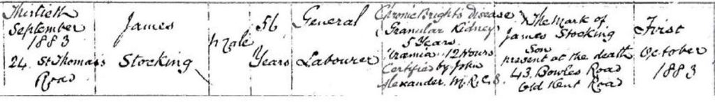 James Stocking, General Labourer of 24 St Thomas Road, died on 30 September 1883. He was only 56 years old. It seems he had been unwell for some time, as the cause of death is “Chronic Brights Disease, Granular Kidneys, 5 years. Uraemia, 12 hours”. Brights Disease is now known as Chronic Nephritis, and is often accompanied by high blood pressure and heart disease.