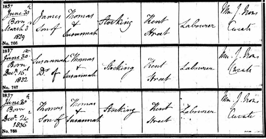 Helpfully, the register shows the children’s dates of birth: James Stocking was born on 3 March 1829; sister Susannah, on 16 December 1832 and brother Thomas on Christmas Eve 1836. Their father Thomas Stocking is shown at the time as a Labourer of Kent Street. The couple had previously baptised a daughter Susannah, at St Saviour, Southwark, born in 1827, who died in 1829. At the time of her baptism, her parents’ address is just given as ‘St George’s’.