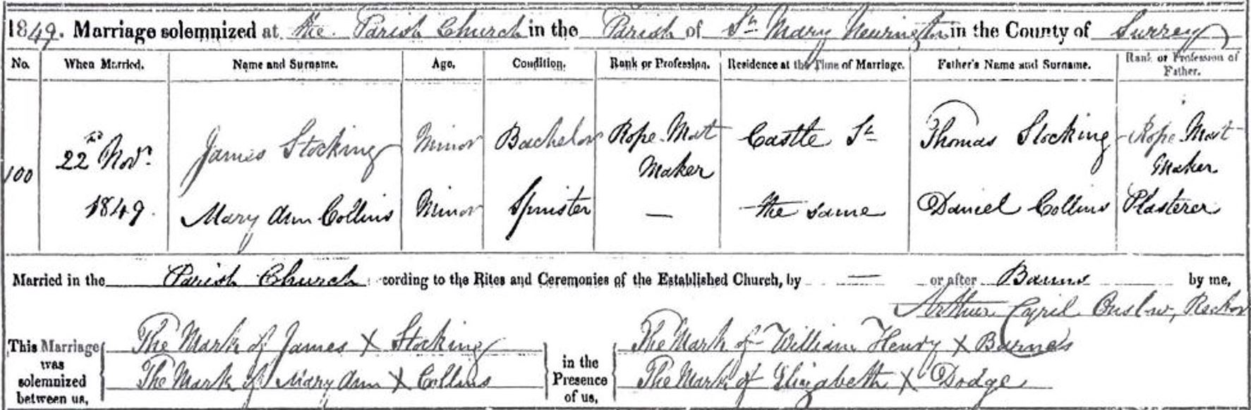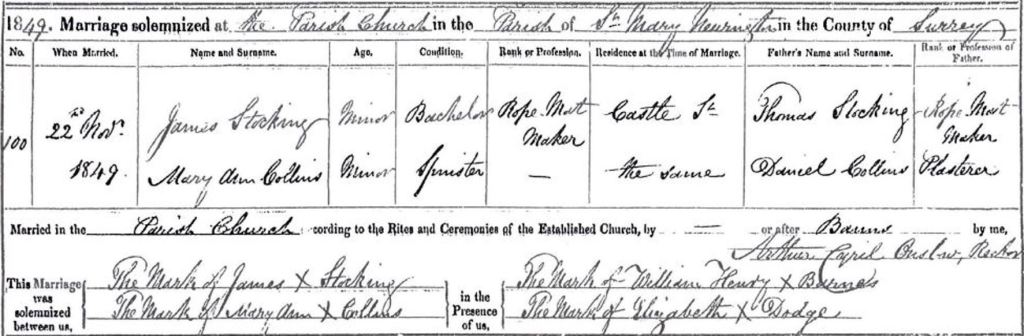 - Marriage certificate James Stocking and Mary Ann Collins, 1849 (GRO)