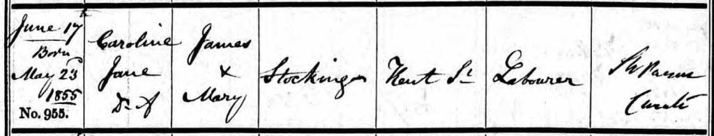 - Baptism record for Caroline Jane Stocking, 1855 (Ancestry.co.uk)