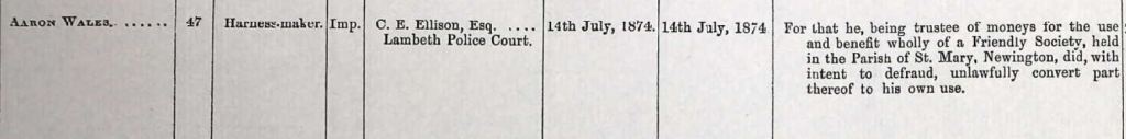 Three years later, on 14 July 1874, my 3xgreat grandfather Aaron Wales was tried at Lambeth Court for embezzlement. The Calendar of Prisoners held at The National Archives and available at Ancestry and also FindMyPast shows that Aaron had been a trustee for a Friendly Society, and had embezzled funds for his own use: