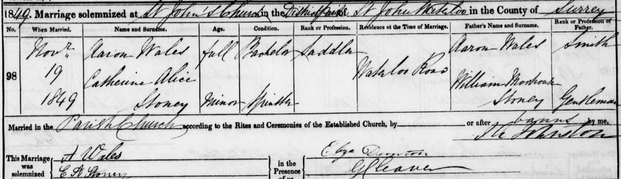 Aaron Wales was 21 or over (‘full’ age), while his bride was a minor. Aaron is a Saddler, son of another Aaron Wales, a Smith. Intriguingly, Catherine’s father is shown as William Moorhouse Stoney, Gentleman (but that’s another story). The names of the witnesses appear to be Eliza Denton/Dunton and G Cleaner? – the latter also witnessed another marriage so may have been a church official. Bride and groom give their address as Waterloo Road, and they married at St John’s Waterloo. The Greek Revival style church had opened twenty years earlier. Waterloo Station had opened nearby a year before the wedding, in 1848.