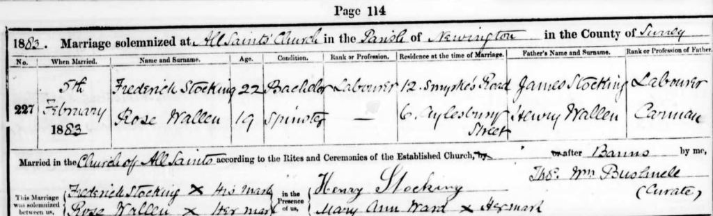 On 5 February 1883 he married Rose Wallen at the Church of All Saints, Walworth, London. The copy of the marriage register (London Metropolitan Archives via Ancestry) confirms that the groom is the son of James Stocking, his siblings Henry Stocking and Mary Ann Ward are witnesses. The bride is just 19 years old (born 1864), the daughter of a Carman, Henry Wallen. Her address is given as 6 Aylesbury Street. Neither bride nor groom could write their names.