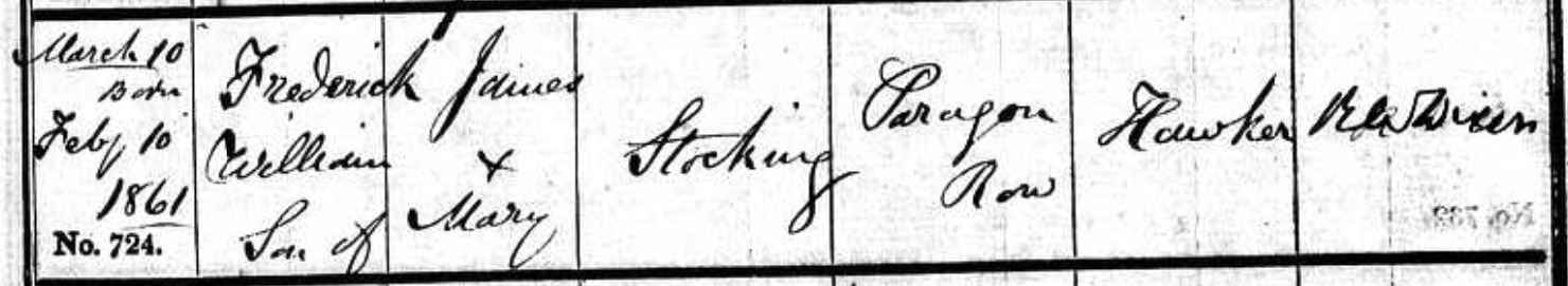 Frederick was the fourth son and sixth child of my 3xgreat grandparents James Stocking and his wife Mary Ann Collins. His baptism (below) at St Mary Newington shows that he was initially named Frederick William, but by the time his birth was registered, he was Frederick James.
