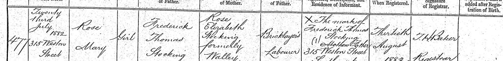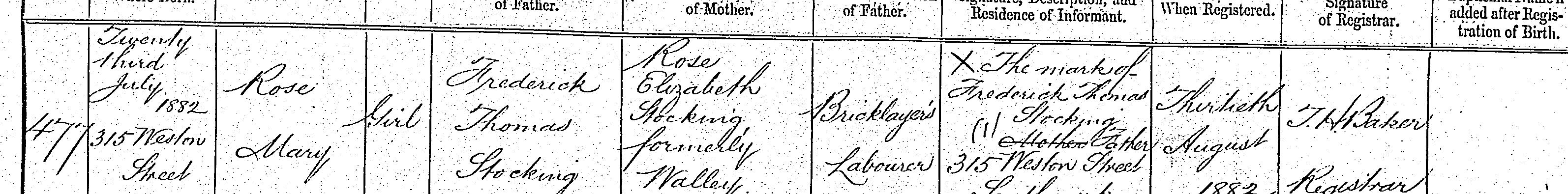 Her birth date is given as 23 July 1882, at 315 Weston Street. Her father registered the birth, giving his name as Frederick Thomas Stocking (a third variation), her mother’s name as Rose Elizabeth Stocking, formerly Walley.