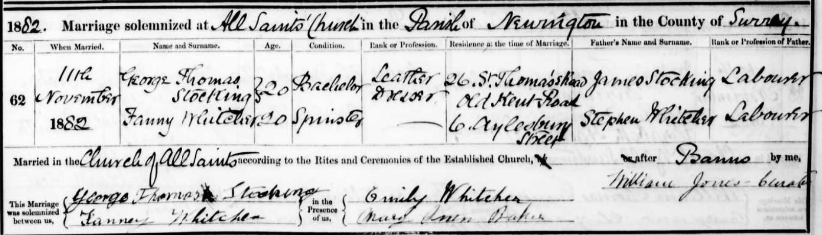 George was the fifth son and seventh child of my 3xgreat grandparents James Stocking and his wife Mary Ann Collins. His baptism record (no image) of 12 October 1862 at St Mary Newington records his date of birth as 12 September that year. Like his ten siblings, he lived with his parents (as attested by the 1871-1881 censuses) until he married, aged 20, on 11 November 1882 at All Saints Walworth.