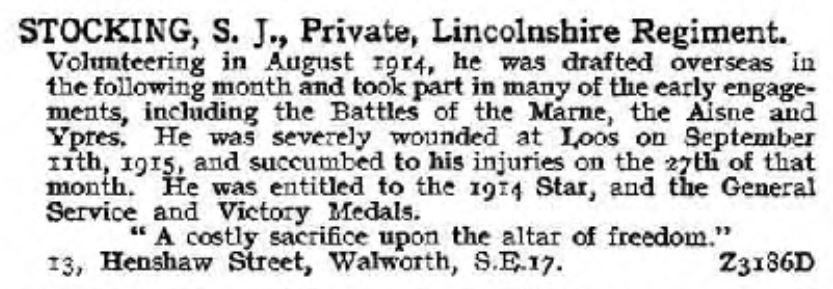 The couple were to lose two further sons in World War I. Stephen James Stocking was born in 1886, their second son. Aged 18, in 1904, he joined the Lincolnshire Regiment, but was discharged as medically unfit less than a year later. On 31 March 1907, he married Amelia McLoughlin at St Mary Magdalen, where he had been confirmed, aged 18, two years earlier. His father witnessed the marriage. Four of their five children survived infancy. When he signed up to join the armed forces again on 8 November 1914, their youngest son was just over a year old. In May 1915, he was admitted to hospital in Rouen, his condition ‘not yet diagnosed’. He returned to fight, however, as Private 8218 Stocking of the 1st Lincolnshire Battalion sustained gunshot wounds, and died later of pneumonia on 27 September 1915. He is commemorated at the Etaples Cemetery (IV. G. 12A).