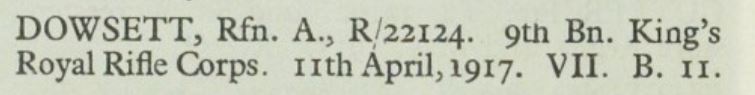 Maud Eliza Stocking, born in 1891, married Albert Dowsett on 22 February 1914. I haven’t found his Army Service Record, so don’t know when he joined up, but they had two children: Albert William Dowsett, born 20 November 1914, and Maud Sarah Elizabeth Dowsett, born in 1916. Private R/22124 of the 10th Battalion, King’s Royal Rifle Corps (London Regiment) died of wounds received in battle on 11 April 1917.