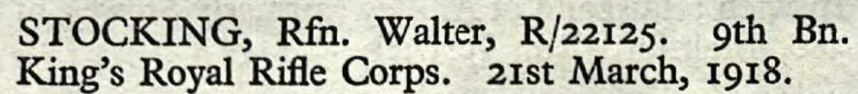 Private Stocking 22125 of the 9th Battalion KRRC was finally declared dead, his official date of death accepted as 21 March 2018, the date he was posted missing. He died of wounds, aged 22. Operation Michael, which started the German Spring Offensive, was initiated on the date Walter went missing/died. According to Wikipedia, it was launched from the Hindenberg Line near Saint-Quentin i France. The offensive heralded the end of the First World War for Germany. Rifleman Walter Stockingis commemorated at Pozieres Cemetery, on The Somme.