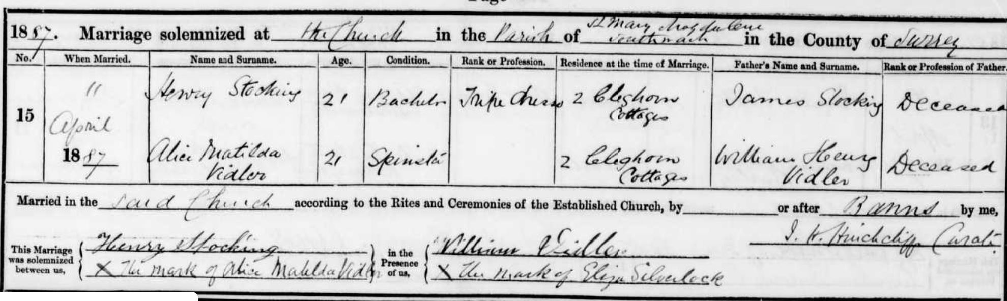 By the age of 14, he was already working as a general labourer. In 1886, when he was 20, there is a record for a Hy Jno. Stocking being appointed as a Postman in NW London; this may or may not be the same man. However, by the time he married Alice Vidler at St Mary Magdalene, Southwark, on 11 April 1887, the marriage register shows him as a Tripe Dresser.