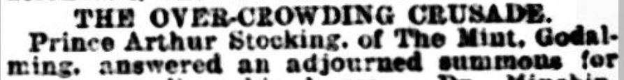 Prince Arthur Stocking of The Mint, Godalming, answered an adjourned summons for over-crowding his house. Dr Minchin, Medical Officer, stated that since the last hearing, the defendant had made arrangements that would improve matters somewhat. If that were the case the Sanitary Authority would be prepared to accept that as a temporary measure. There were now in the house Mr and Mrs Stocking and a baby. Three children were boarded out. He thought that this was an unsatisfactory state of things, but would do temporarily until defendant could get a more suitable house.