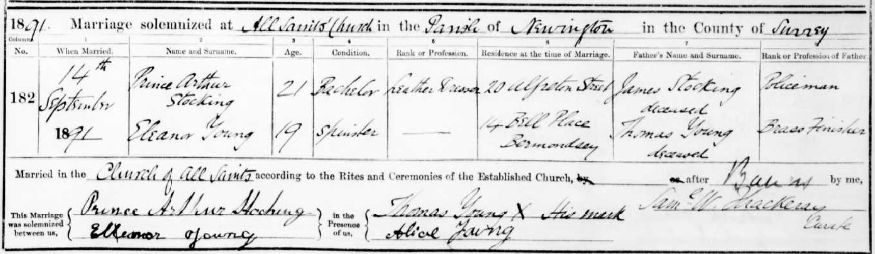 At the time of the 1891 census he is enumerated in his older sister’s household. Mary Ann Stocking had married Packing Case Maker William Ward in 1873 and on census night, they are at 22 Alfreton Street, Bermondsey; Arthur Stocking is now 27 and working as a Leather Dresser (Read more about Mary Ann’s story here). A few months later, on 14 September 1891, Prince Arthur Stocking married Eleanor Young at Walworth All Saints. The marriage register is an interesting record not only for the use of his royal-sounding first name, but also for his father’s occupation being recorded as Policeman. I still do not know if he really was a policeman.