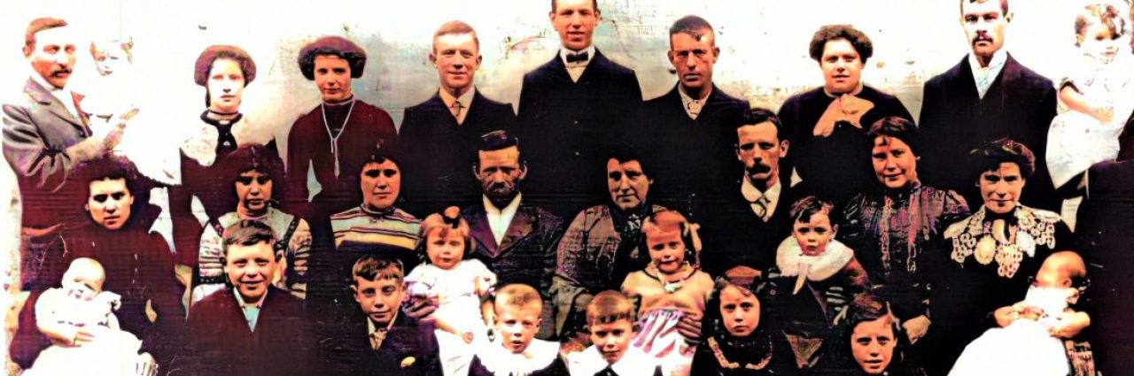 My 2xgreat grandfather James Thomas Stocking married Alice Mary Wales in 1874. They had a remarkable 19 children (some pictured with them below in c.1904); two died as babies and one as a teenager, but the rest survived to adulthood and to marry and raise their own families – producing 43 grandchildren and at least 34 great grandchildren between them. WW1 impacted the family: read the stories of those who served here. Apart from Stocking, descendants’ surnames include: Schofield; Vaines; Humber; Martin; Hanna; Bishop; Partridge; Lawrence; Frost; True; Gash; Evans; Monk; Turner; Gregson; Greenslade; Smith; Golder and Rowson.