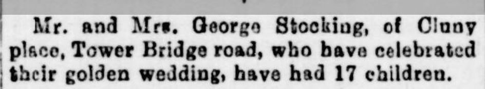 William was a Carman who married Elizabeth Ellen Smith in March 1885 and they had 13 children. The family were very much part of the industries of Bermondsey, and their lives in the teeming streets and noisy factories and wharves close to the Thames are described in this post. Like his older brother George, William and his wife lost several children in infancy and to the First World War. Find out more here. The 11+ descendants of their surviving children bore the surnames Stocking; Chandler; Dowsett; Denney and Garratty.