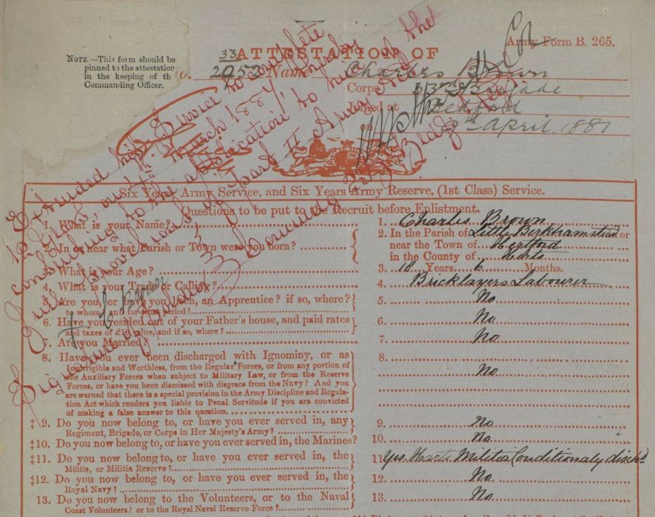 Extract from page 1 of Charles Brown’s Army Attestation records (TNA)