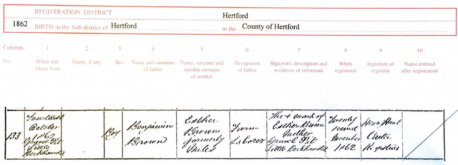 I found a family headed by Benjamin Brown, a 56 year old Agricultural Labourer born in Benington, Herts, with wife Esther, 40 and four children, including Charles Brown, aged eight and born in Little Berkhampsted. This was enough information to find his birth certificate.