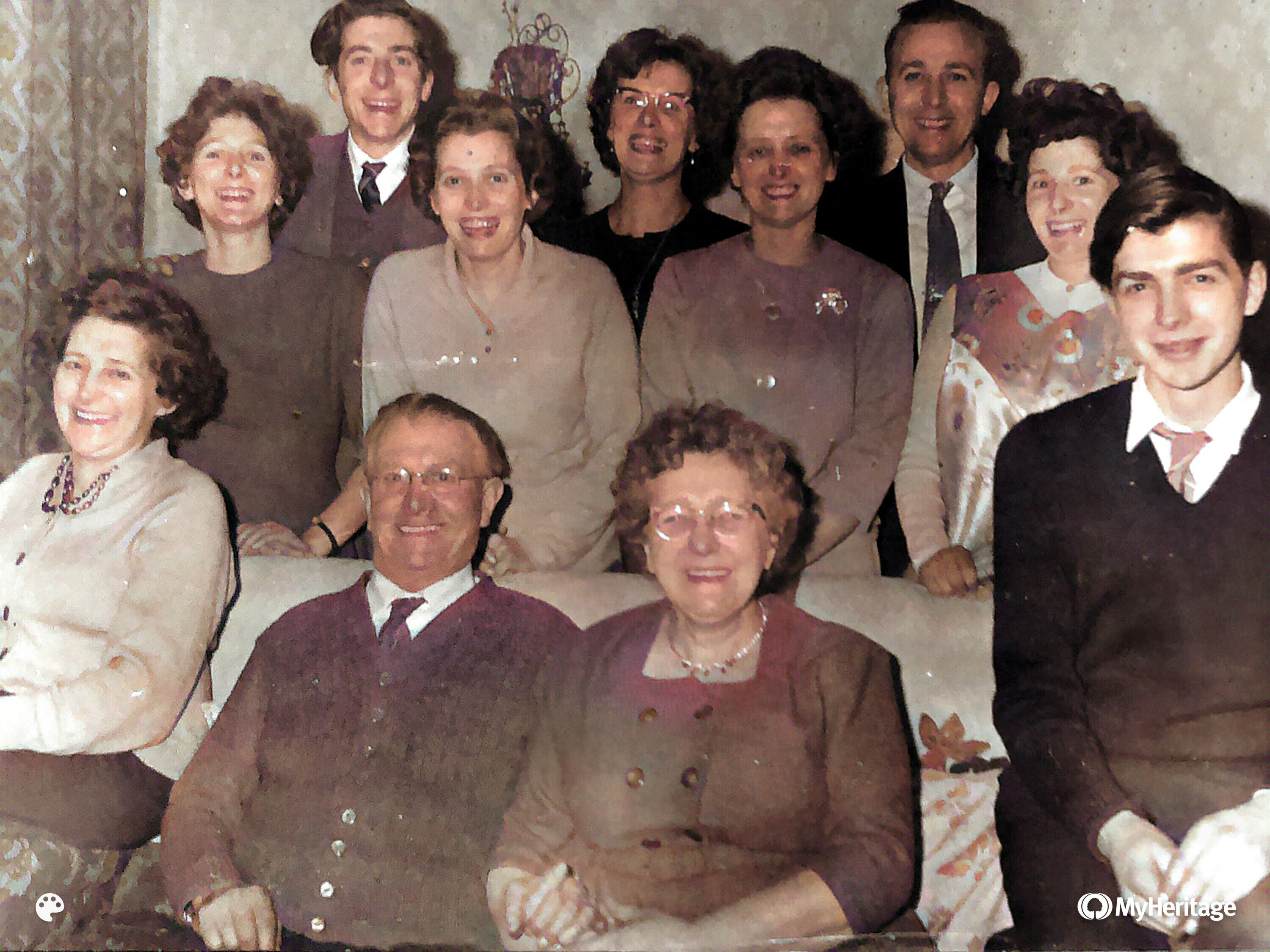 Family photo (colourised at MyHeritage). L-R back row: Evelyn, Harold, Brenda, Dorothy, Vera, Ron, Noreen. L-R front row: ‘Venny’, Horace, Elizabeth, Michael.