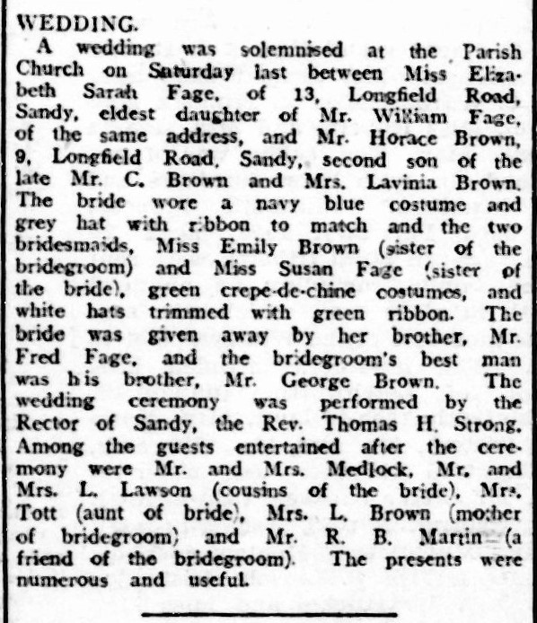 Elizabeth Sarah Fage, (who was also known as Beth and Lizzie), is described as the eldest daughter of William Fage, both of 13 Longfield Avenue, Sandy. Her husband Horace Brown, known as Harry, was the second son of the late C Brown and Lavinia Brown, of 9 Longfield Road. So they were fairly close neighbours. Beth’s best griend, and Horace’s sister, Emily Brown, and the bride’s sister Susan Fage, were bridesmaids.