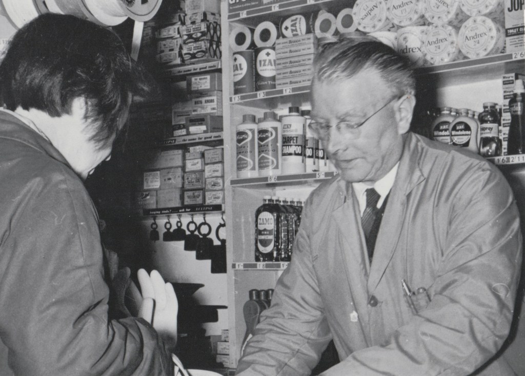 This photo shows Grandad Brown serving a customer in the shop. Look at all those old brand names and packaging on the shelves behind him! Lots of toilet papers and cleaning products, but on the left, the weights used to weigh out loose products, and what look like boxes of screws or nails.