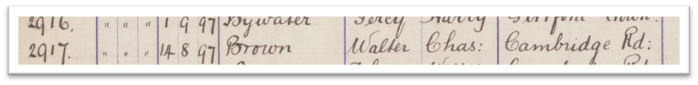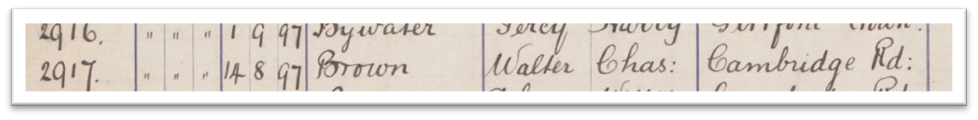 Although his father had died two years earlier, he is still shown as the son of ‘Chas’, of Cambridge Road. The ‘destination on leaving’ is shown as ‘Market Garden L.C’ (local council?), probably his first job. It seems he didn’t stick to it for long as, on 26 August 1910, the Biggleswade Chronicle reported that he was temporarily being employed as a season messenger by the Post Office when he had an accident on his bicycle, attempting to avoid colliding with a railway trolley, and fracturing his elbow.