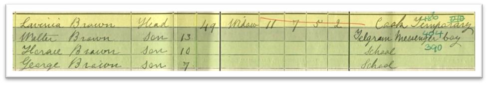 She is 49 and working as a Cook (Temporary), and states that she was married for 11 years, had seven children, two of whom had died. The two eldest girls, Emily Brown and Esther Clara Brown, have left home, probably to find work; her three boys, aged 7-13, are still living with her. Consistent with the newspaper article above, Walter Brown is still working as a Telegram Messenger Boy for the Post Office.