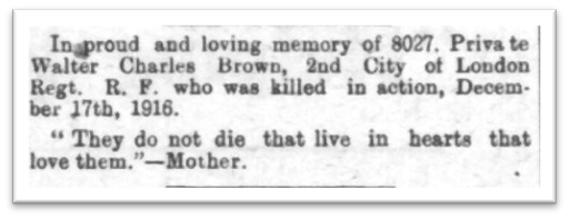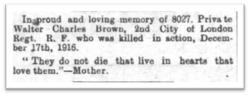 Private Walter Charles Brown, (CWGC record) killed in action 17 December 1916