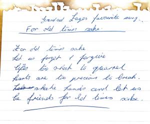 Grandad Fage’s favourite song, written out by my Mum, Noreen Stocking.