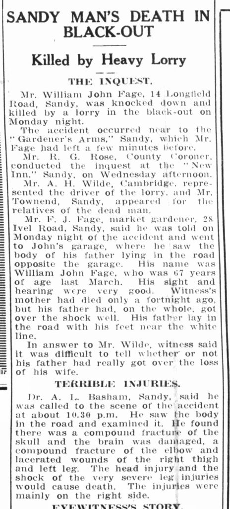 The inquest heard that Sandy man Mr William John Fage, of 14 Longfield Road, Sandy, was knocked down and killed by a lorry in the blackout. The accident took place on the Great North Road, close to The Gardener’s Arms pub, which William had left “a few minutes before”.