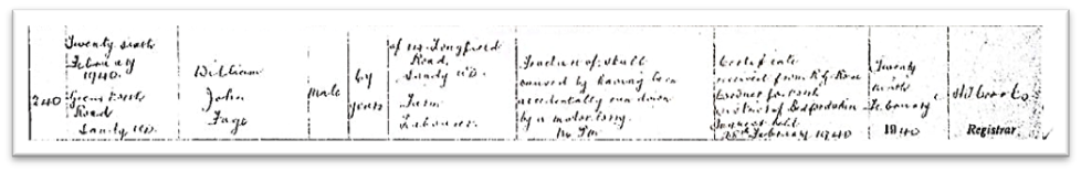 The Coroner’s verdict is reflected in the cause of death on William John Fage’s death certificate, stated as “Fracture of skull caused by having been accidentally run down by a motor lorry. No PM.” The certificate was received from R G Rose Coroner for the district of Bedfordshire, inquest held 28 February 1940”.