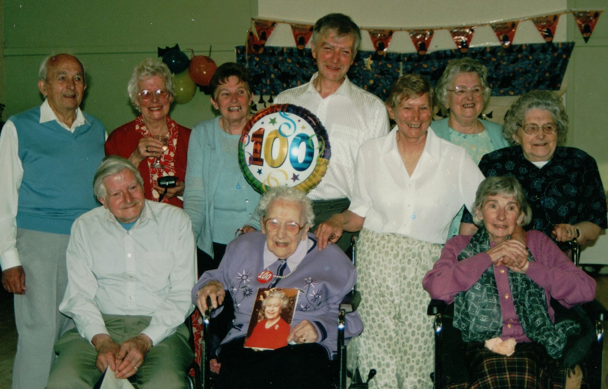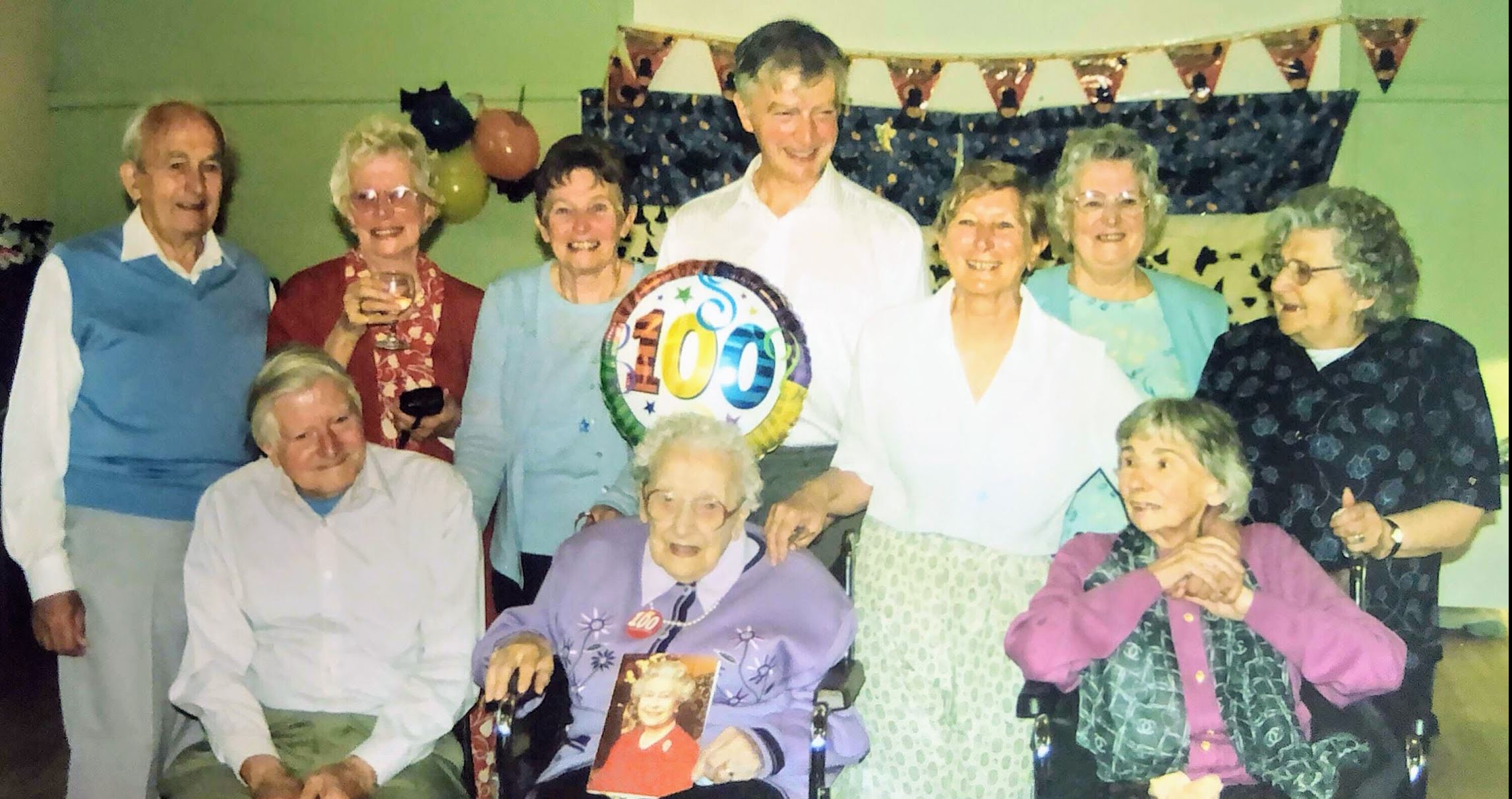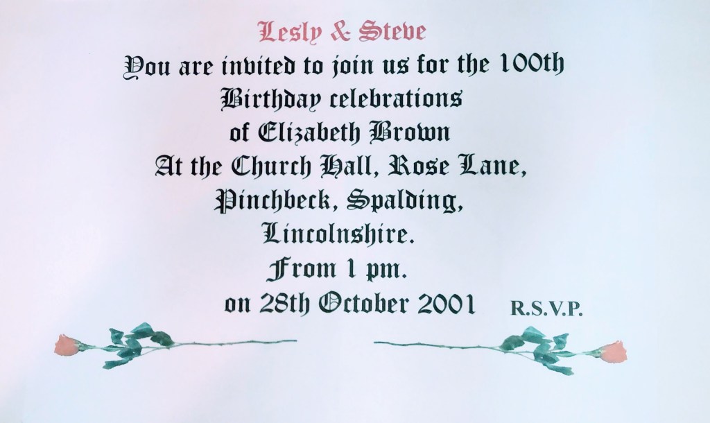 The photos above show her celebrating her 100th birthday with her grown up children on 28 October 2001 (see invitation below). L-R, from back row: Ron, Dorothy, Brenda, Michael, Evelyn, Vera and Veeny. Front row: Harold, Nana, Noreen (my Mum).