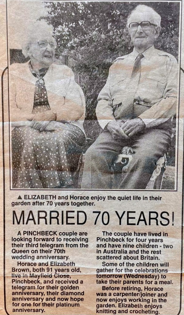 The stories of her life in service before her marriage, and of raising her family in Bedfordshire, Essex and London during and after WW2, have been told elsewhere. After they retired from their hardware business in London, they moved with their eldest and youngest sons, Harold and Michael, to a bungalow in Pinchbeck, near Spalding in Lincolnshire. In February 1993, they celebrated their Platinum wedding anniversary, as reported in the Lincolnshire Free Press on 23 February that year. My Mum kept the cutting from the newspaper (below), which notes that they were hoping for an anniversary card from the Queen, to follow those received for their Golden and Diamond anniversaries.