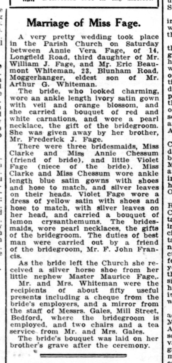 The Biggleswade Chronicle of 6 October 1933 (below) describes the ‘very pretty church wedding’ which took place the previous Saturday, 30 September between Miss Annie Vera Fage and Mr Eric Beaumont Whiteman at Sandy’s Parish Church.