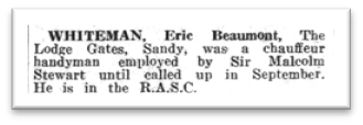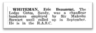 In September 1940, Eric Beaumont Whiteman joined the Royal Army Service Corps. The Biggleswade Chronicle of 4 October of that year carried the notice, left, of the fact and of his former occupation.