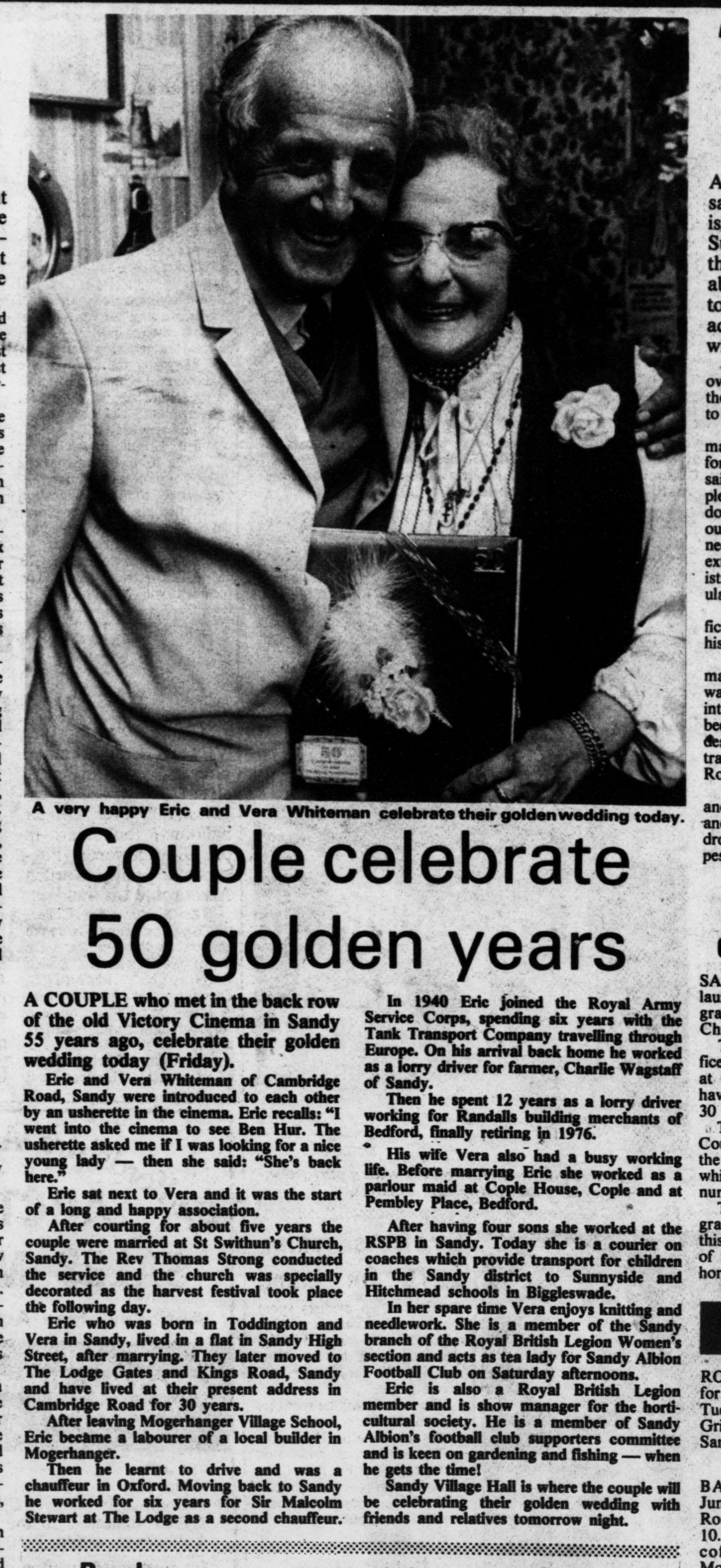 The electoral registers of 1949 find them at 28 Cambridge Road, Sandy, which was to be their home for at least four more decades. The couple were much involved in the local Sandy community and celebrated their Golden Wedding Anniversary on 30 September 1983. They were joined by many friends and relatives for a party at Sandy Village Hall the following evening. The article (below) from The Biggleswade Chronicle of 30 September that year reports on the planned event and provides much detail of their long married life together.