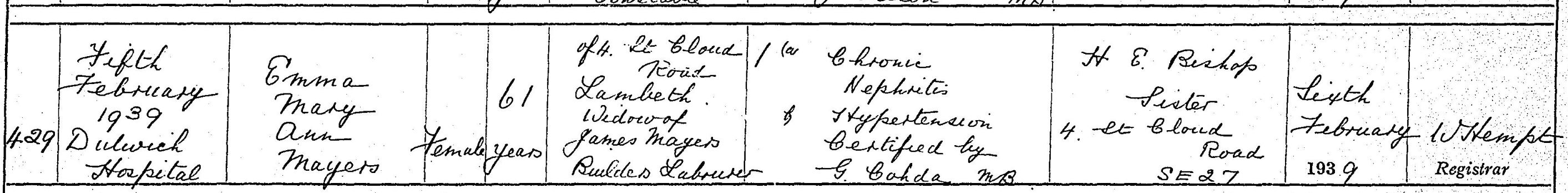 The early 1930s see Emma living at 4 St Cloud Street, a few streets away from Durban Road. She did not live to see the outbreak of WW2; she died at Dulwich Hospital on 5 February 1939 of Acute Nephritis (kidney disease) and Hypertension. Her usual address was 4 St Cloud Street, and her sister, H E Bishop, registered the death. It seems that Emma continued living with her sister until her death, as Harriett’s home address is the same.