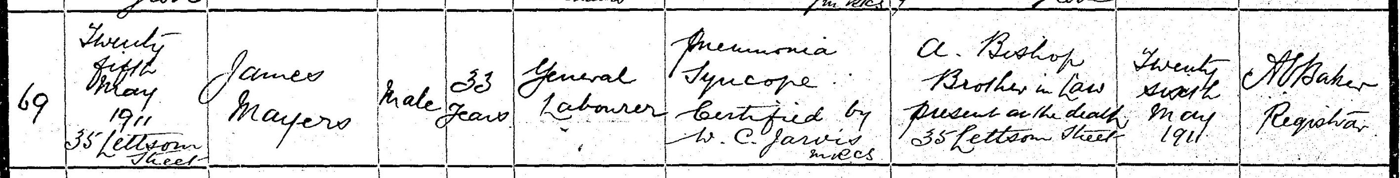 Sadly, James Mayers died on 25 May 1911, not long after the census was taken. He may have had a short illness, as he signed the census form on 2 April that year. His death certificate shows that he died at his home address, of pneumonia and ‘syncope’ (fainting).