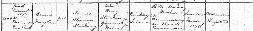 Emma Mary Ann Stocking was born on 9 December 1877. Her birth was registered in January 1878 by her mother, born Alice Mary Wales, who was 20 years old, and already had two children. Her father, James Thomas Stocking, was 24 and working as a Bricklayer’s Labourer.